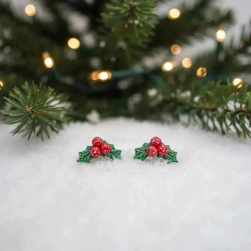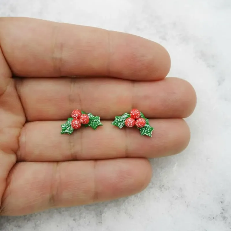 Christmas snowy Holly stud earrings, lovingly handmade with Polymer Clay and Stainless Steel.