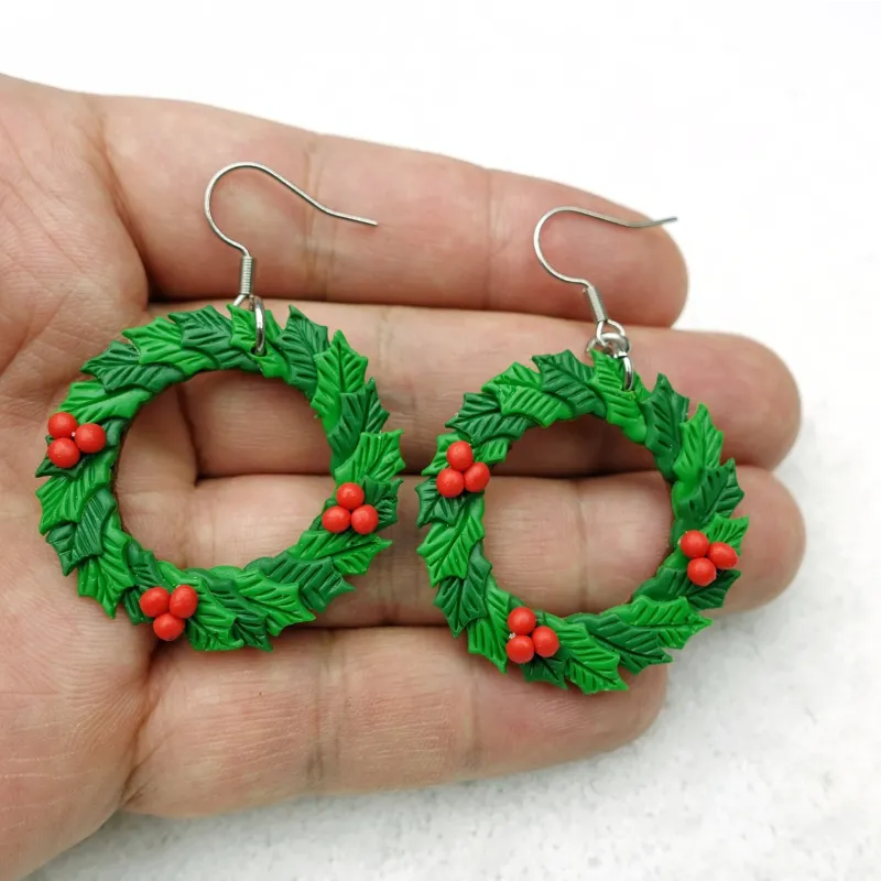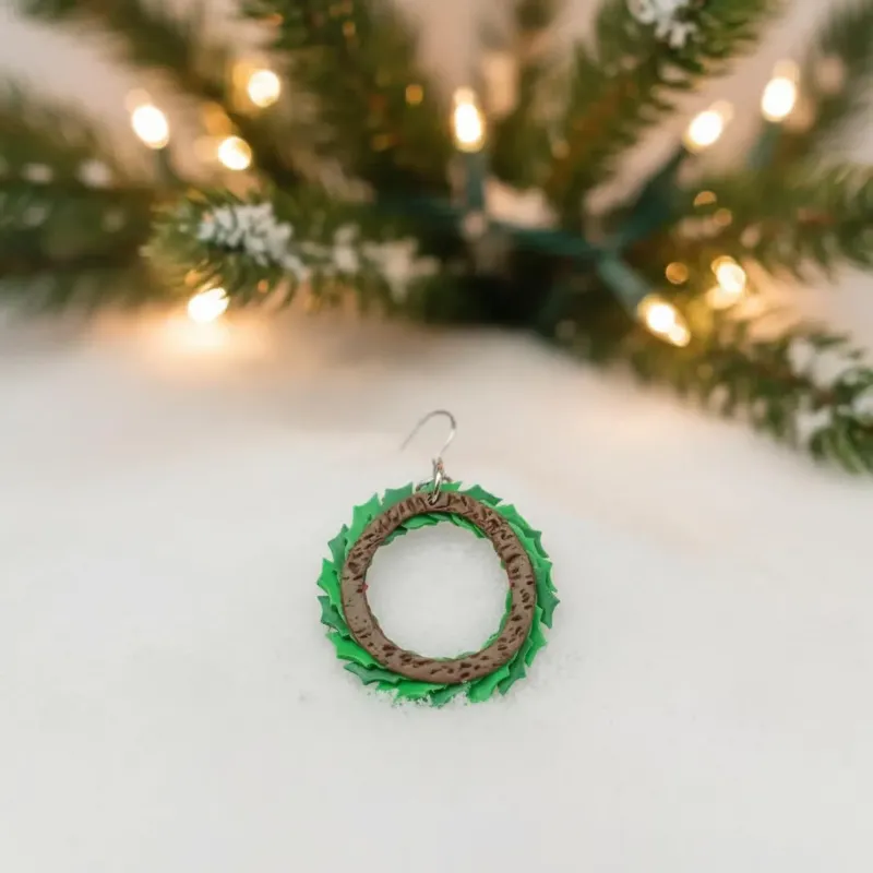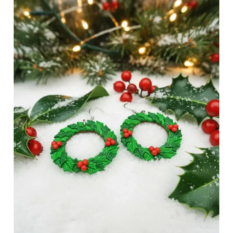 Christmas Holly Wreath dangle earrings, lovingly handmade with Polymer Clay and Stainless Steel. (Sterling Silver option available)