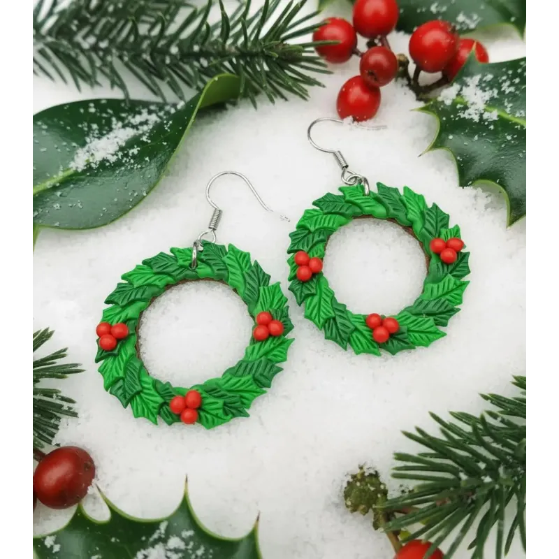 HOLLY WREATH EARRINGS | Christmas Holly Dangle Earrings | Handmade with Polymer Clay | Cute, Stocking Filler, Novelty, Gift, Cracker