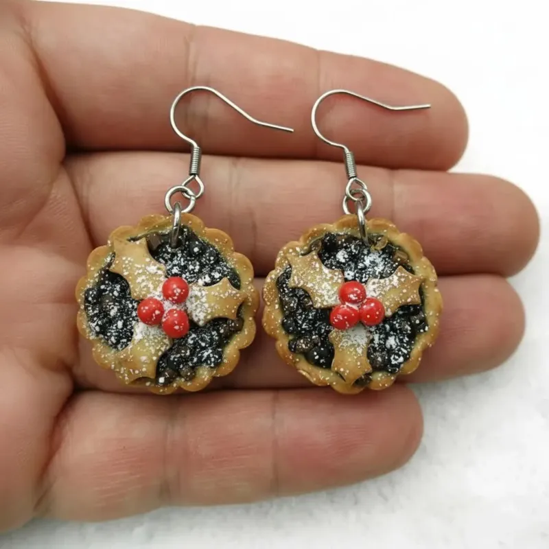 Christmas Mince Pie with Holly Berry crust dangle earrings, lovingly handmade with Polymer Clay and Stainless Steel. (Sterling Silver option available)