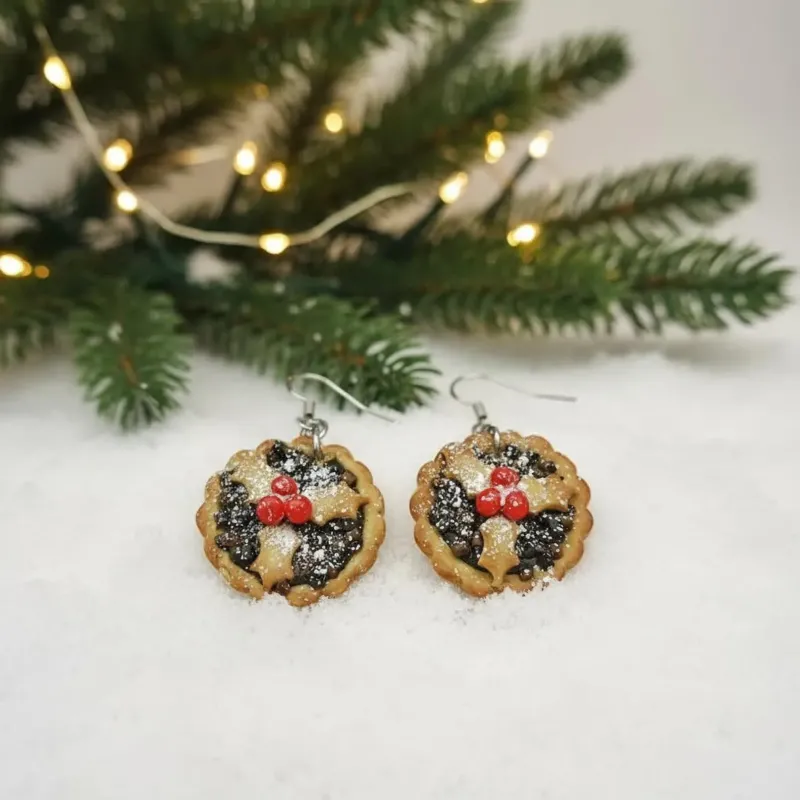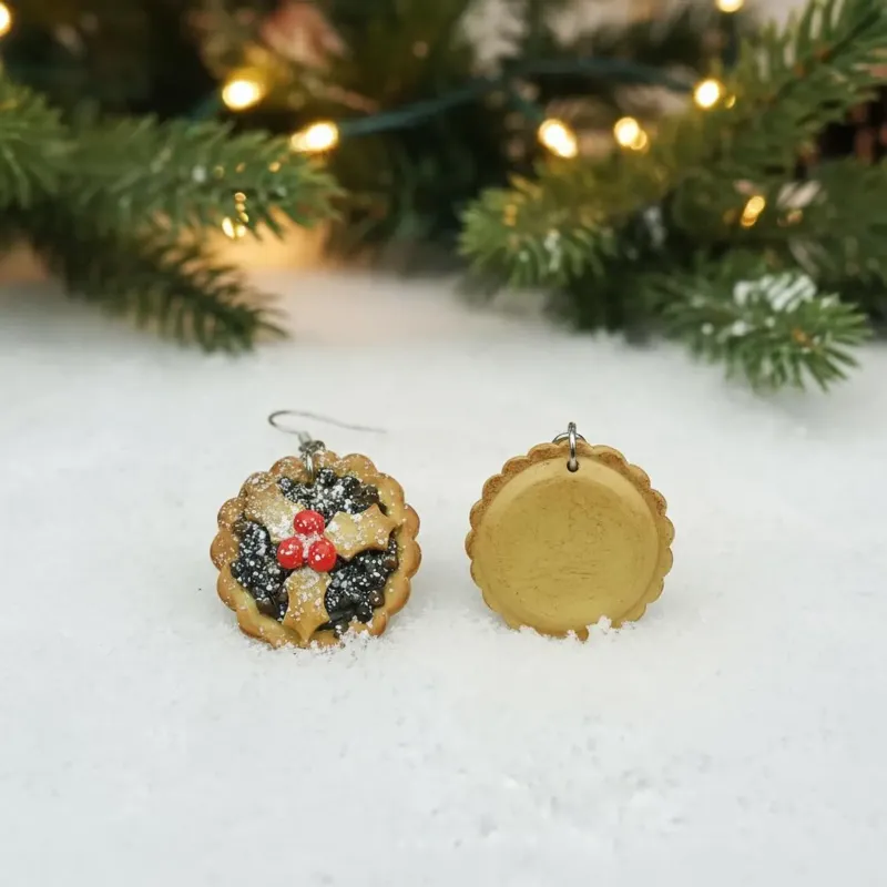 MINCE PIE EARRINGS with Holly Berry | Christmas Pies Dangle Earrings | Handmade with Polymer Clay | Stocking Filler, Gift, Icing Dusting