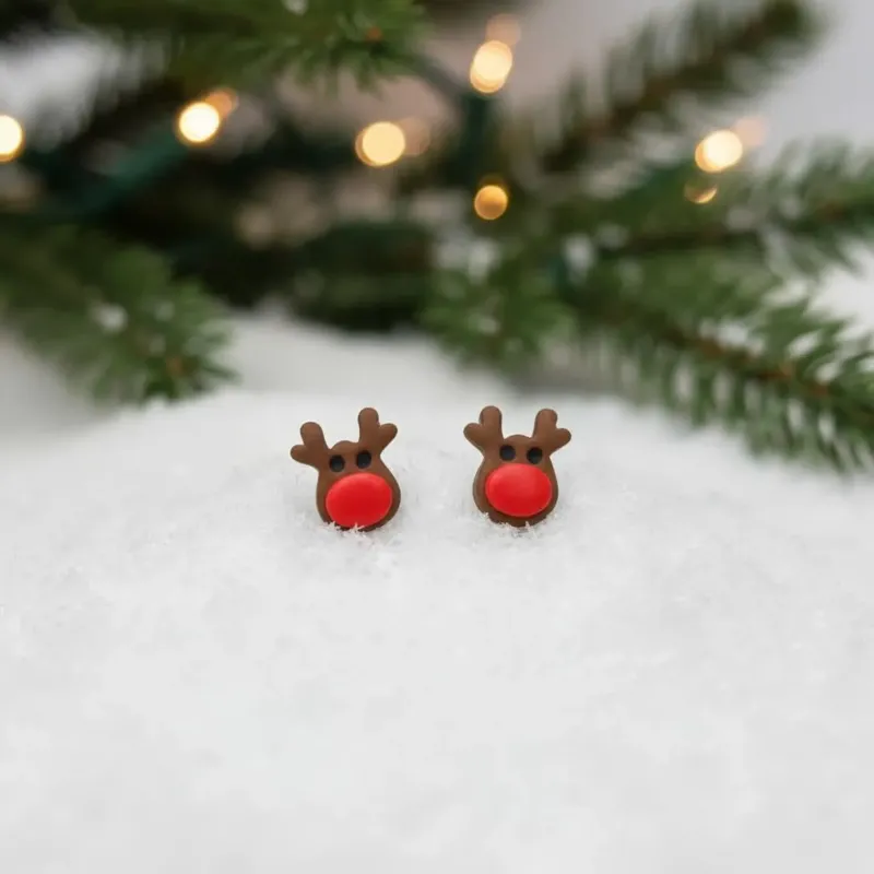 REINDEER CHRISTMAS EARRINGS | Rudolf Red Nose Stud Earrings| Handmade with Polymer Clay | Stocking Filler, Winter, Festive, Gift, Present