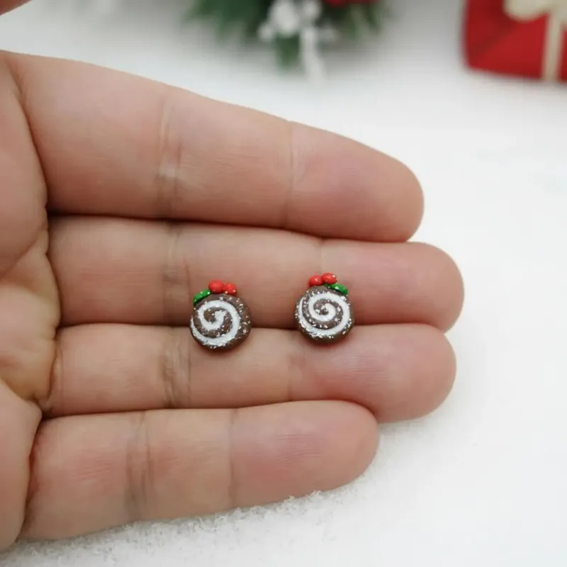 Yule Log with holly and berry stud earrings, handmade with care from polymer clay and finished with stainless steel posts. A festive dessert-inspired design that captures the charm of a Christmas yule log, complete with holly decoration, making them a sweet seasonal accessory or a thoughtful gift.